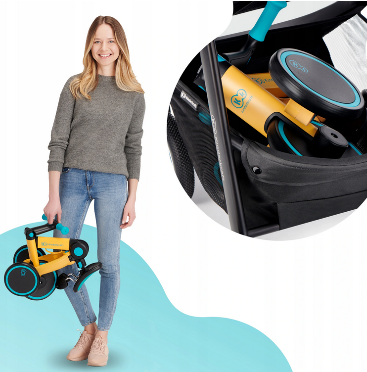 4TRIKE to rowerek dopasowany także do rodzica. W każdej chwili możesz odczepić pedały, by zmienić rowerek w biegówkę, a następnie schować je pod siodełkiem. Dzięki temu zawsze będą pod ręką! Ten rowerek to mistrz prostych rozwiązań. Koła wystarczy obrócić i złączyć ze sobą, aż usłyszy się ciche “klik”. Następnie zablokuj je łącznikiem i gotowe. By przekształcić biegówkę w rowerek trójkołowy, należy wyciągnąć łącznik i rozłożyć nóżki. 4TRIKE ma specjalny uchwyt na kierownicy, który służy do przenoszenia rowerka. Maluch postanowi biec o własnych siłach? Teraz bez problemu przeniesiesz rowerek! Rowerek trójkołowy 4TRIKE składa się do kompaktowych rozmiarów. Zmieścisz go do bagażnika czy kosza wózka, a także pewnie chwycisz w rękę i wniesiesz na piętro w bloku. Niewielkie wymiary po złożeniu pozwalają także na efektywniejsze przechowywanie rowerka w mieszkaniu.