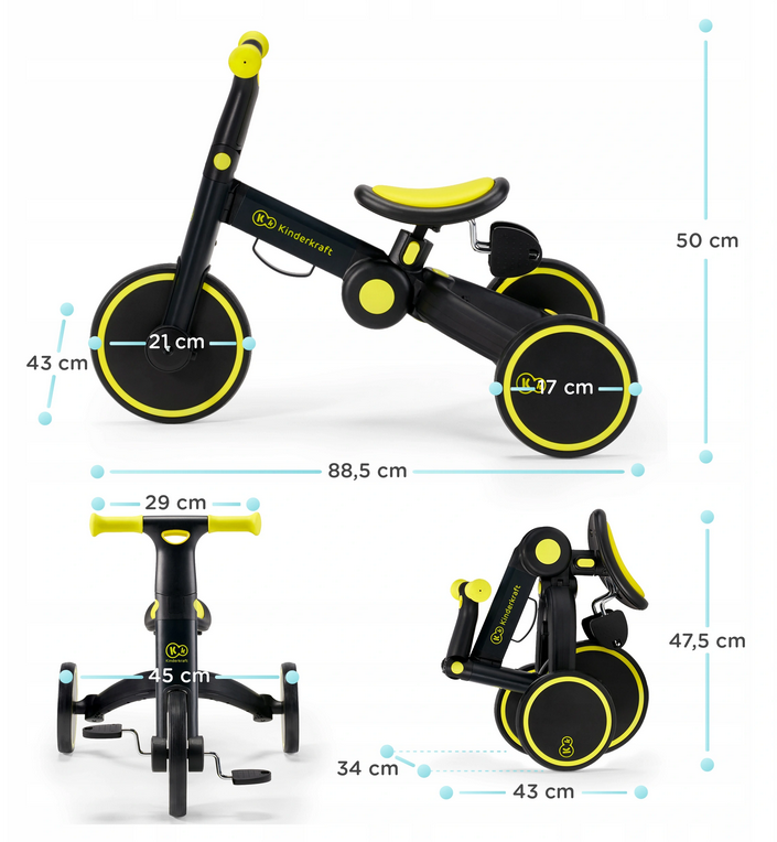 Wymiary: Rozłożony rowerek: długość: 88,5 cm, wysokość: 50 cm, szerokość: 43 cm.