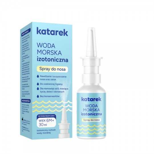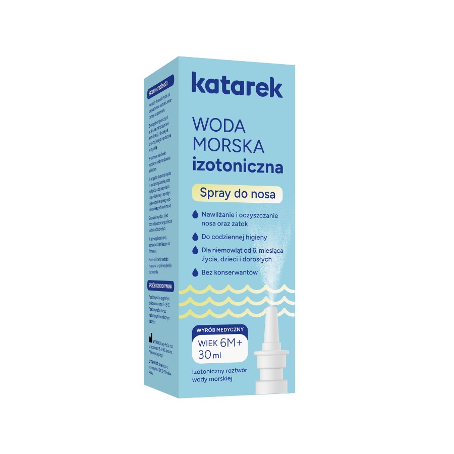 Katarek Woda Morska Izotoniczna pochodzi z głębin Oceanu Atlantyckiego. Czysta, bogata w minerały, delikatna nawet dla najmłodszych. Przyjazna dla kobiet w ciąży. Przydatna zarówno podczas choroby jak i w codziennej pielęgnacji. Pomaga oddychać swobodnie. Nawilża błonę śluzową. Usuwa to, co utrudnia naturalny oddech. Z troską, jakiej oczekują rodzice. Od 6. miesiąca życia. Bez konserwantów. Wyrób medyczny kl. I