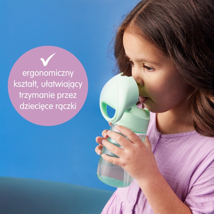 • Funkcjonalna: ergonomiczny kształt zapewnia wygodne użytkowanie dostosowane do małych rąk dzieci. Solidny uchwyt ułatwia przenoszenie oraz wyjmowanie butelki z plecaka lub torby. Butelkę łatwo otworzyć za pomocą przycisku – po naciśnięciu otwiera się klapka, a słomka jest gotowa do użycia!