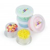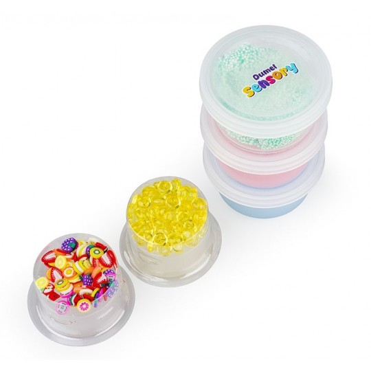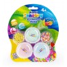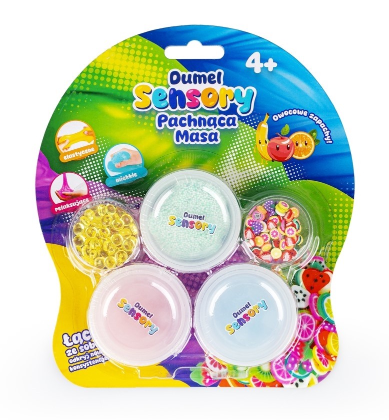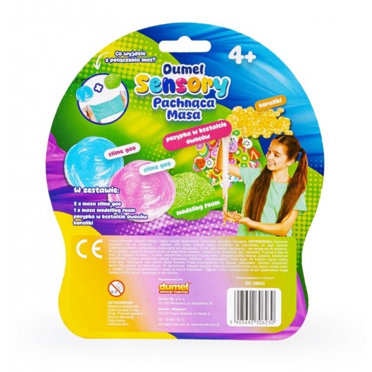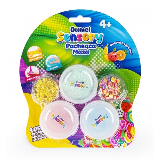 Masa radości o zapachu owoców! Odkryj zestaw zapachowych mas, stworzonych do kreatywnej i sensorycznej zabawy. Zestaw tworzą trzy kubeczki z masą, różniącą się kolorem. Dwie z nich, o nazwie slime goo, mają konsystencję żelową, a jedna – modeling foam, ziarnistą. Łącz masy ze sobą i odkrywaj nowe kolory oraz faktury! Poza masami, w zestawie znajdziesz także akcesoria do zabawy, w postaci posypki w kształcie owoców oraz koralików. Pamiętaj, że raz połączonych ze sobą mas nie da się już rozdzielić, dlatego najlepiej najpierw bawić się pojedynczymi masami, a dopiero gdy dobrze się je pozna, wtedy połączyć je ze sobą, uzyskując w ten sposób nową masę. Dobrym rozwiązaniem jest też zmieszanie ze sobą jedynie niewielkiej ilości każdej z mas, co pozwoli na uzyskanie równocześnie mas o różnych kolorach i fakturach. Aby zapobiec wysychaniu mas, pamiętaj, by po zakończeniu zabawy schować je do szczelnie zamkniętego opakowania lub woreczka. Produkt przeznaczony jest dla dzieci od 4 roku życia.