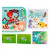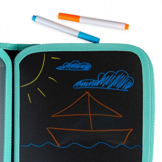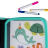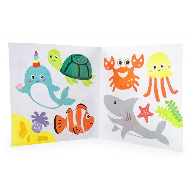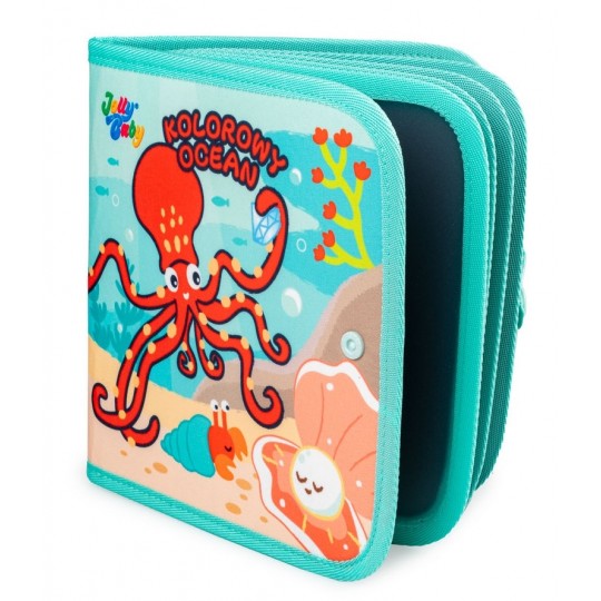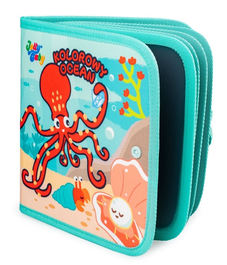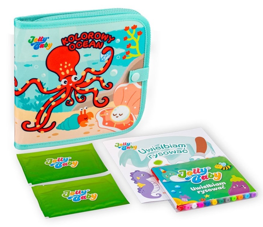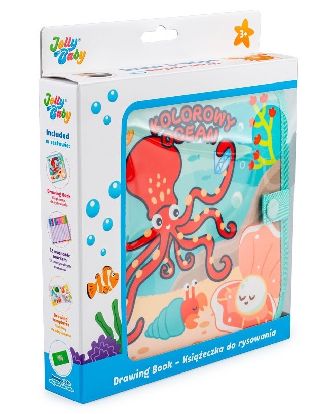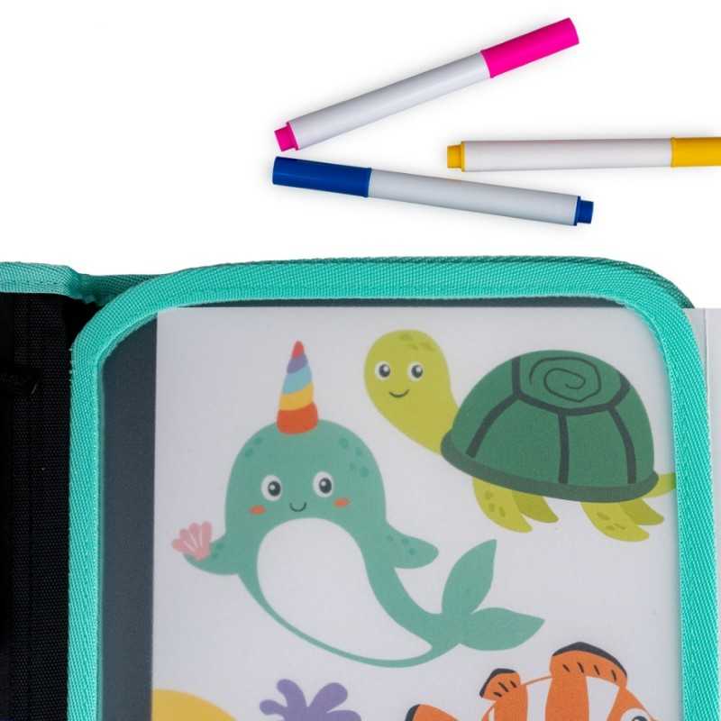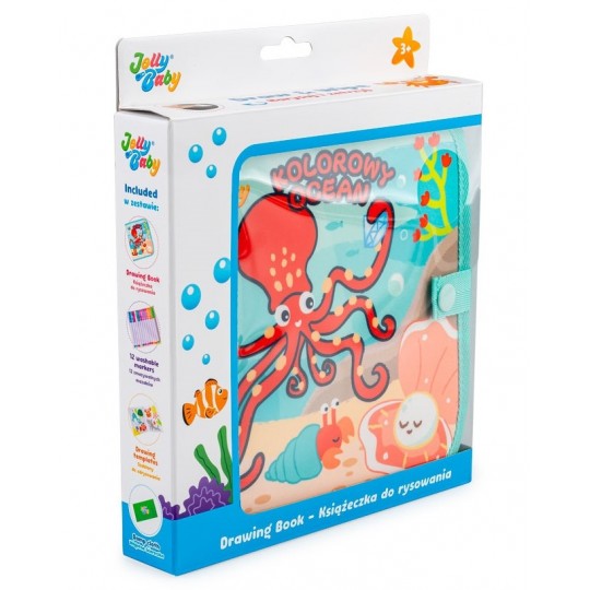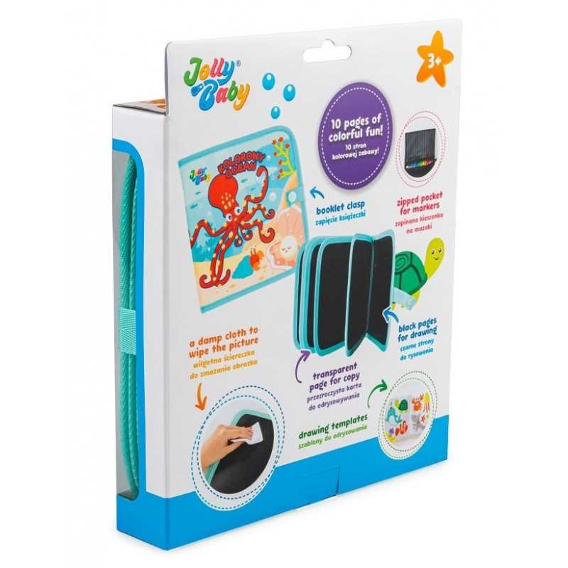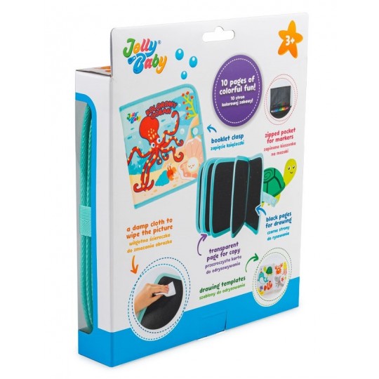 Baw się kolorowo, tworząc piękne rysunki! Książeczka składa się z barwnej okładki, ozdobionej obrazkami zwierzątek z oceanu, a także z czarnych, pustych stron do rysowania i jednej przezroczystej karty. Po podłożeniu pod nią dołączonego do zestawu arkusza z szablonami, możesz odrysować wybrany przez siebie obrazek. Wewnątrz książeczki znajduje się kieszonka zapinana na zamek błyskawiczny, w której zmieszczą się mazaczki z zestawu. Poszczególne strony książeczki są zmywalne, dzięki czemu bez trudu usuniesz narysowane na nich obrazki, za pomocą dołączonej do książeczki wilgotnej ściereczki. Produkt przeznaczony jest dla dzieci od 3 roku życia.