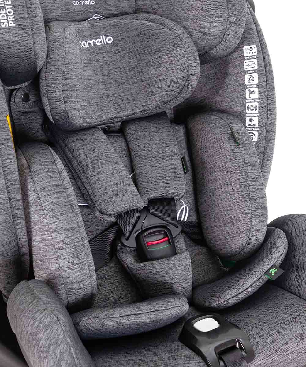 Unikalny, wielopozycyjny zagłówek pozwala precyzyjnie dopasować go do wzrostu dziecka – z dokładnością do 1 mm. Pasy i bardzo wytrzymały 5-punktowy zamek zapewniają bezpieczne trzymanie dziecka. Chowany przycisk blokady z zielonym wskaźnikiem zamknięcia i charakterystycznym kliknięciem uniemożliwia jego nieprawidłowe użycie. Pasy są zaprojektowane dla maksymalnej wagi 18 kg.