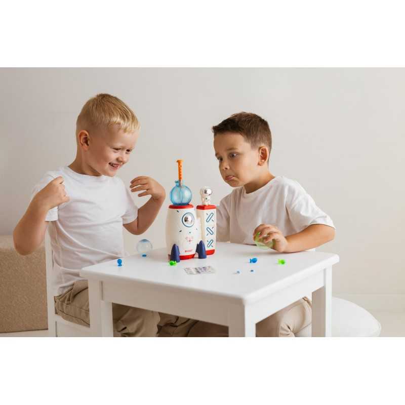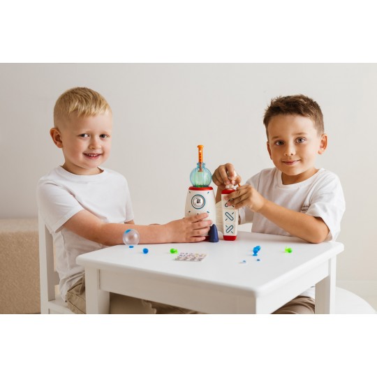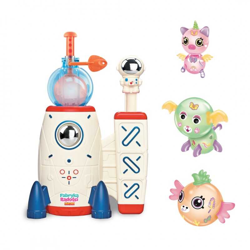 Misja: balonowa frajda! Wraz z kosmiczną rakietą baw się odlotowo, dmuchając kolorowe baloniki i łącząc je ze sobą w urocze stworki. Powłoka baloników jest delikatnie klejąca, dzięki czemu bez trudu sczepisz je ze sobą, nie używając do tego kleju! W zestawie, poza balonikami i maszynką, czeka na ciebie aż 90 naklejek i akcesoriów do upiększenia balonowych postaci. Produkt przeznaczony jest dla dzieci od 3 roku życia.