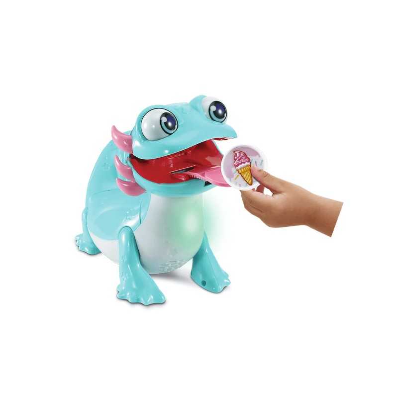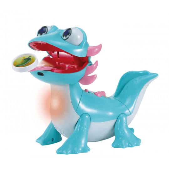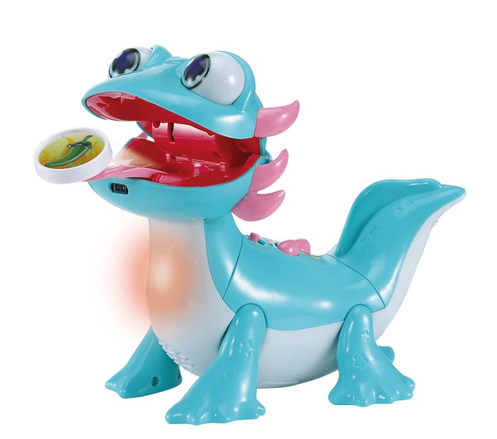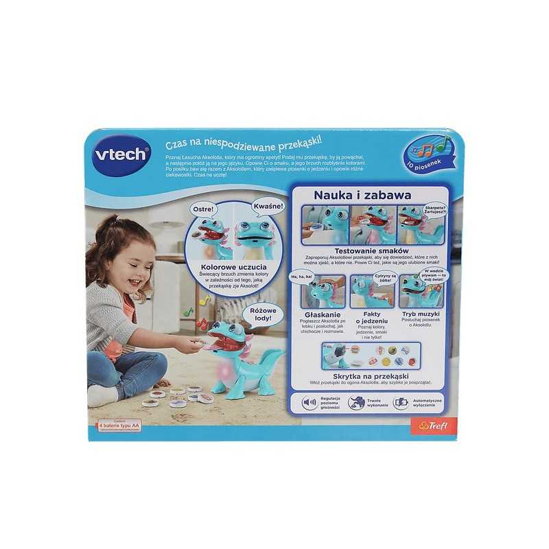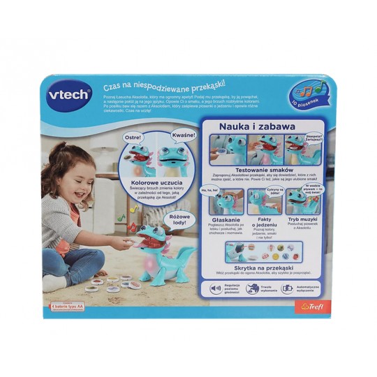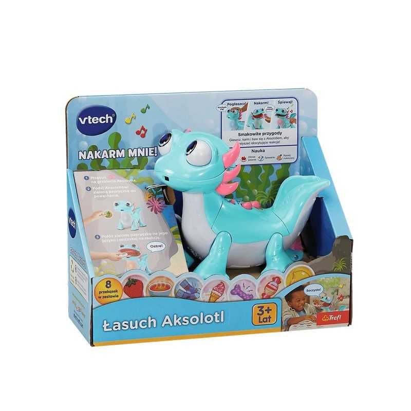 Poznaj Łasucha Aksolotla – interaktywną zabawkę, która w zabawny i edukacyjny sposób wprowadzi Twoje dziecko w świat kolorów, smaków i ciekawostek o jedzeniu. Ten sympatyczny aksolotl ma ogromny apetyt i uwielbia różnorodne przekąski. W zestawie znajdziesz aż 8 kolorowych przekąsek, które maluch może mu podać – wystarczy, że aksolotl je powącha, a następnie umieścisz smakołyk na jego języku. Aksolotl opowie o smaku przekąski, a jego świecący brzuszek rozbłyśnie pięknymi kolorami.Po posiłku zabawa wcale się nie kończy! Dwa interaktywne przyciski uruchamiają aż 10 wesołych piosenek edukacyjnych i ciekawostek o aksolotlach, jedzeniu oraz kolorach. Dzięki wbudowanym czujnikom ruchu i dotyku zabawka reaguje na interakcje dziecka, co rozwija motorykę i pobudza wyobraźnię. A jeśli aksolotl zbyt wiele razy otrzyma przekąskę, której nie lubi – rozbawi malucha, wydając zabawny dźwięk pierdnięcia. Praktyczna skrytka pozwala przechowywać wszystkie przekąski w jednym miejscu.Łasuch Aksolotl to doskonały towarzysz codziennej zabawy i nauki, który gwarantuje mnóstwo śmiechu i radości podczas każdej uczty!