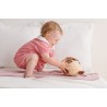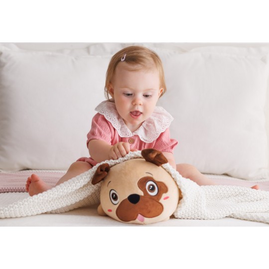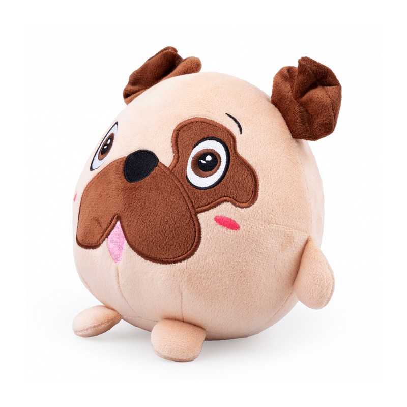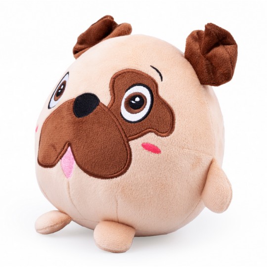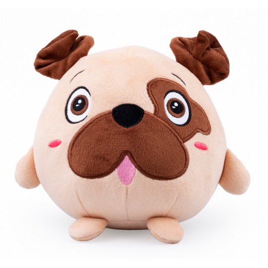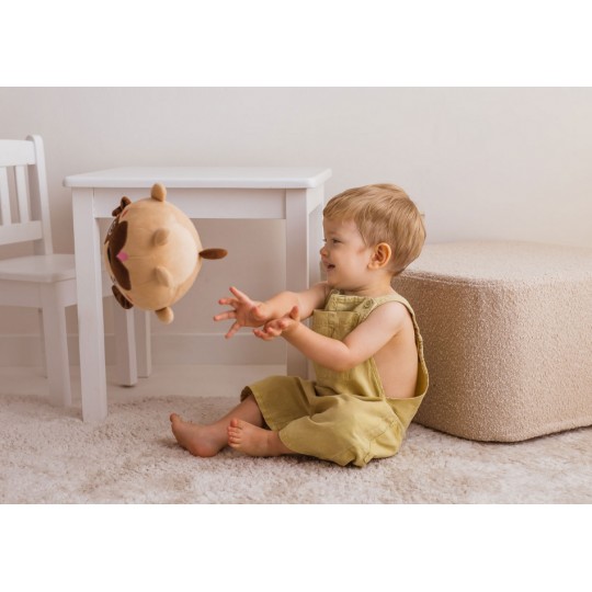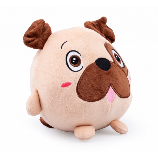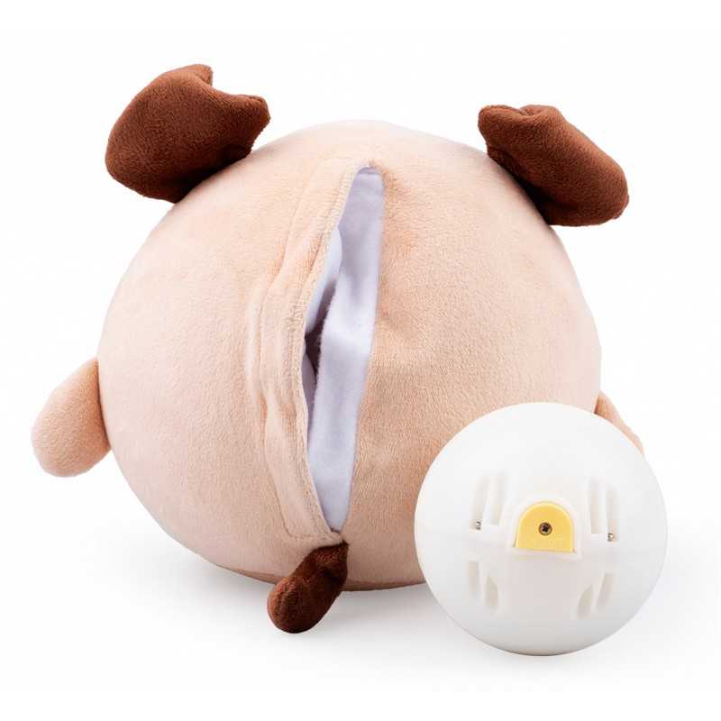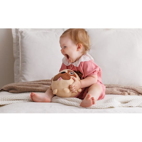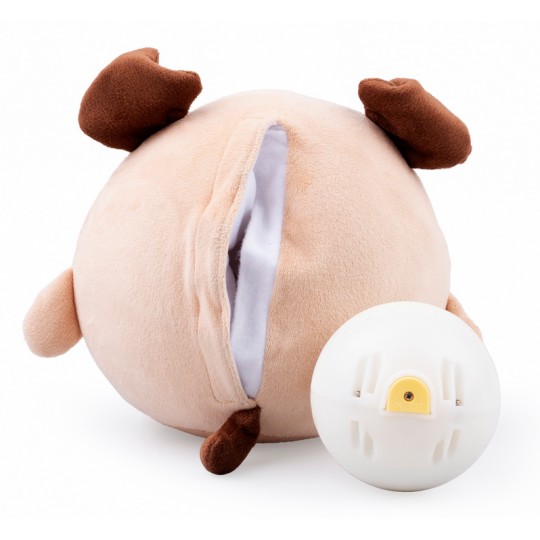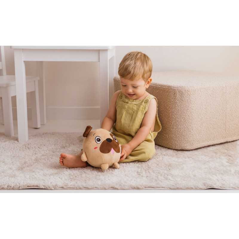 kaczący wesołek potrafi rozbawić nawet ponuraka! Ten uroczy psiak to zabawna piłeczka, która po podrzuceniu lub rzuceniu jej na podłogę zaczyna podskakiwać, przemieszczając się. Czynności tej towarzyszą zabawne zwroty, dodatkowo aktywizujące maluszka, oraz wesołe melodie. W momentach bezczynności zabawka przechodzi w tryb nagrywania, powtarzając zmienionym głosem to, co usłyszy. Aby uruchomić zabawkę, należy odpiąć rzep, i nacisnąć żółty przycisk, znajdujący się na plastikowej piłce, wewnątrz zwierzaka. Piłeczkę tę można wyjąć, w celu wymiany baterii lub wyprania pluszowego zwierzaka. Produkt przeznaczony jest dla dzieci od 12 miesiąca życia.