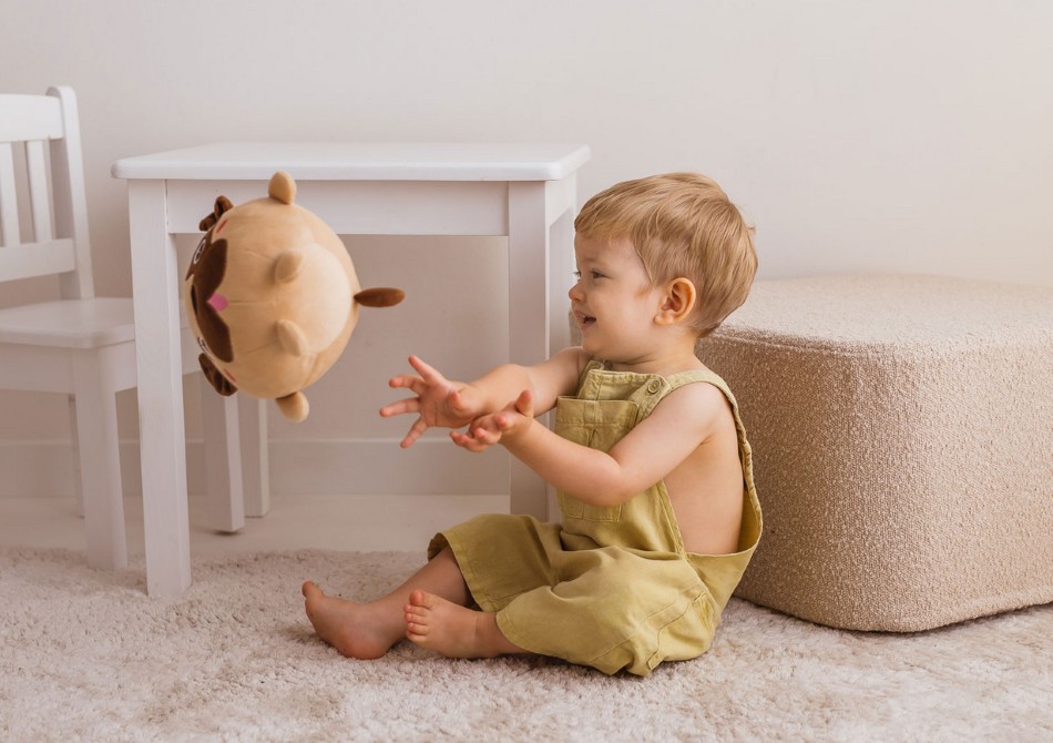 - piłkę uruchamia się poprzez naciśnięcie żółtego przycisku na plastikowej piłce (wewnątrz pluszowego zwierzaka);