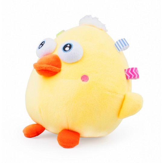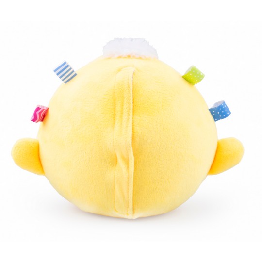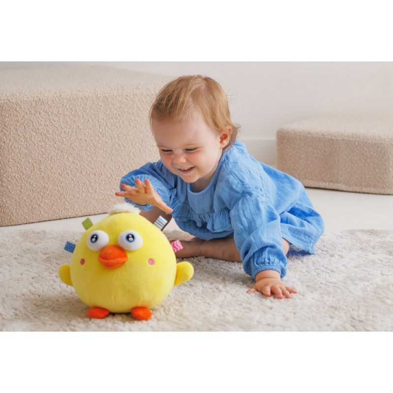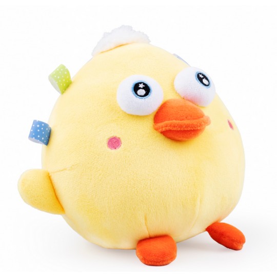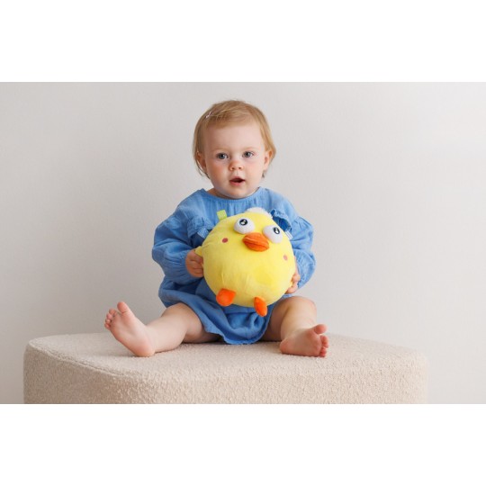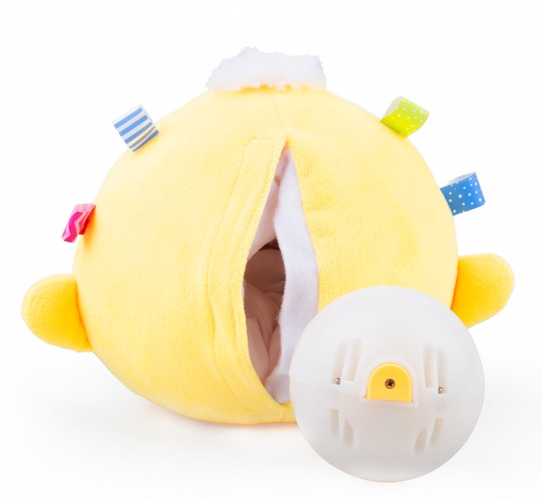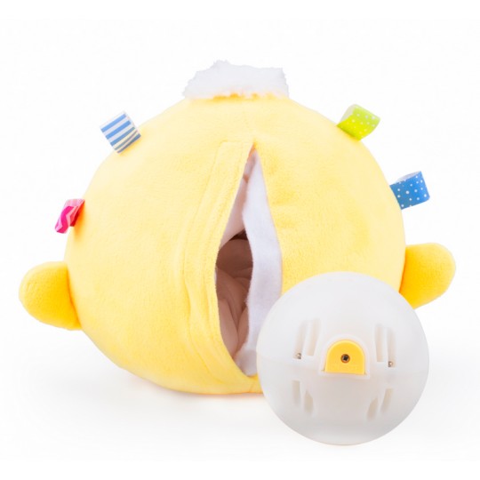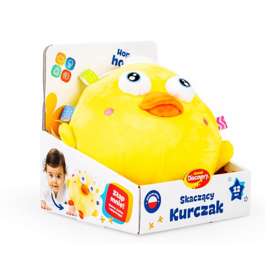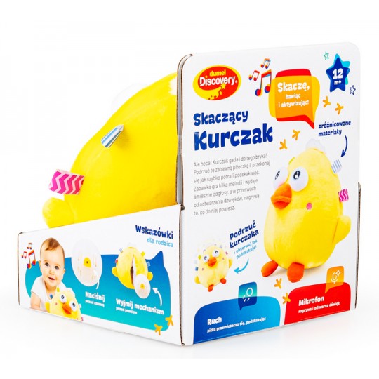 Zwariowany kurczaczek nie usiedzi w miejscu, potrafisz dotrzymać mu „kroku”? Ta wesoła piłeczka po podrzuceniu lub rzuceniu jej na podłogę, zaczyna podskakiwać, przemieszczając się i wypowiadając przy tym zabawne zwroty lub odtwarzając melodie. Kiedy maluch pozostawi ją na miejscu, przejdzie automatycznie w tryb nagrywania, w którym powtarza zmienionym głosem to, co usłyszy. Aby uruchomić zabawkę, należy odpiąć rzep, i nacisnąć żółty przycisk, znajdujący się na plastikowej piłce, wewnątrz zwierzaka. Piłeczkę tę można wyjąć, w celu wymiany baterii lub wyprania pluszowego zwierzaka. Produkt przeznaczony jest dla dzieci od 12 miesiąca życia.