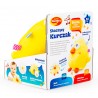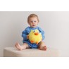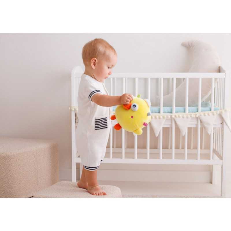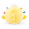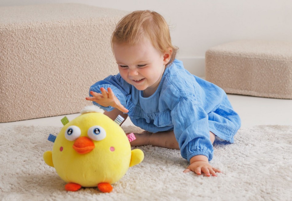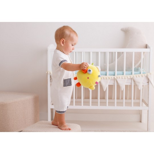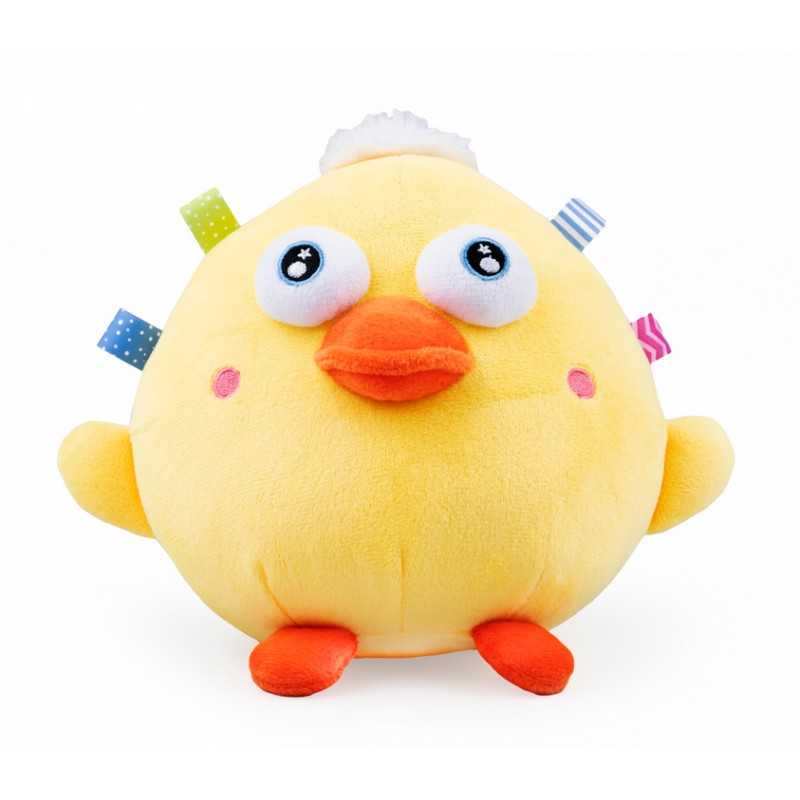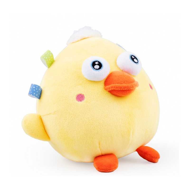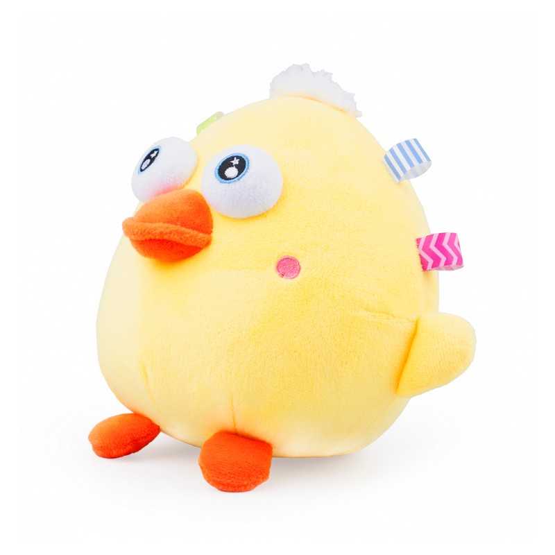 Zwariowany kurczaczek nie usiedzi w miejscu, potrafisz dotrzymać mu „kroku”? Ta wesoła piłeczka po podrzuceniu lub rzuceniu jej na podłogę, zaczyna podskakiwać, przemieszczając się i wypowiadając przy tym zabawne zwroty lub odtwarzając melodie. Kiedy maluch pozostawi ją na miejscu, przejdzie automatycznie w tryb nagrywania, w którym powtarza zmienionym głosem to, co usłyszy. Aby uruchomić zabawkę, należy odpiąć rzep, i nacisnąć żółty przycisk, znajdujący się na plastikowej piłce, wewnątrz zwierzaka. Piłeczkę tę można wyjąć, w celu wymiany baterii lub wyprania pluszowego zwierzaka. Produkt przeznaczony jest dla dzieci od 12 miesiąca życia.