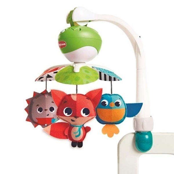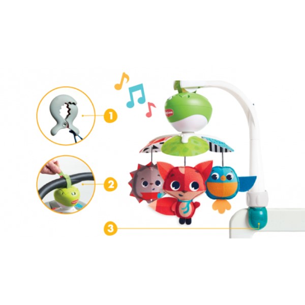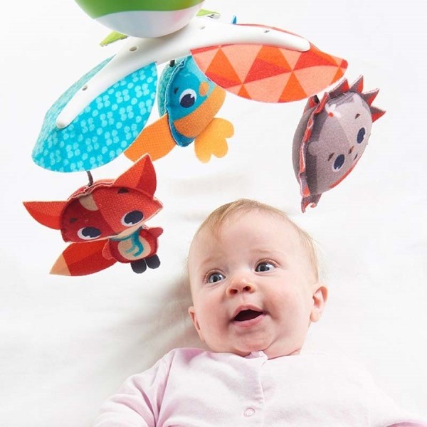 Zmysły - unikatowy design, duże oczy uśmiechniętych postaci łącznie z delikatną muzyką oferują stymulację wzroku i słuchu dziecka, wspomagając ich rozwój.