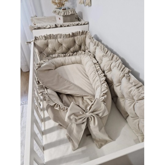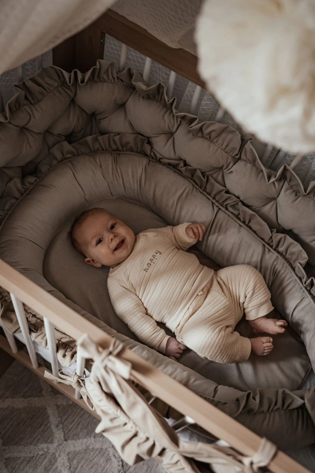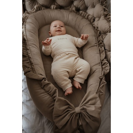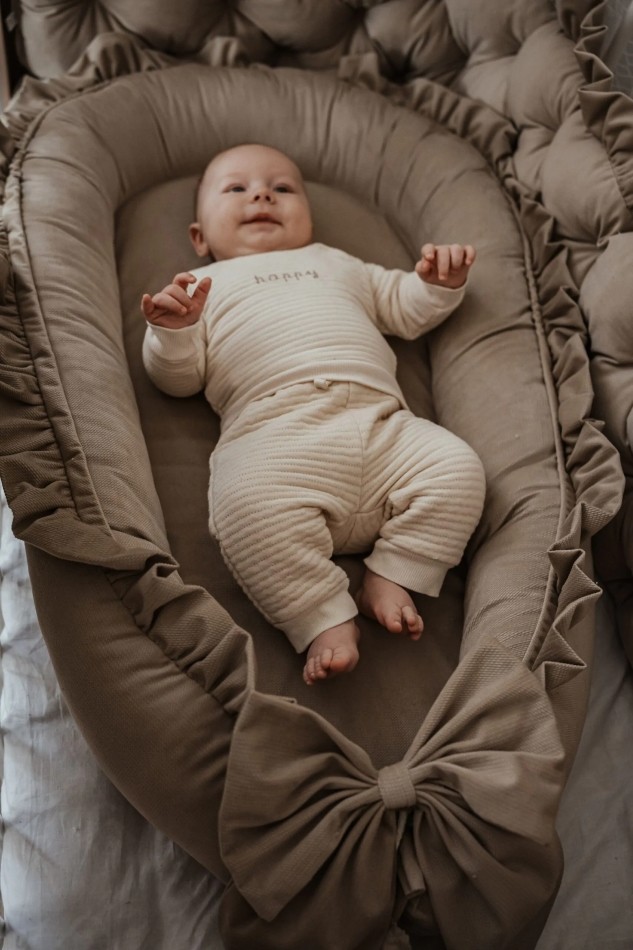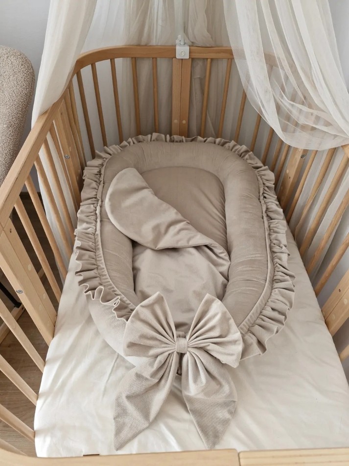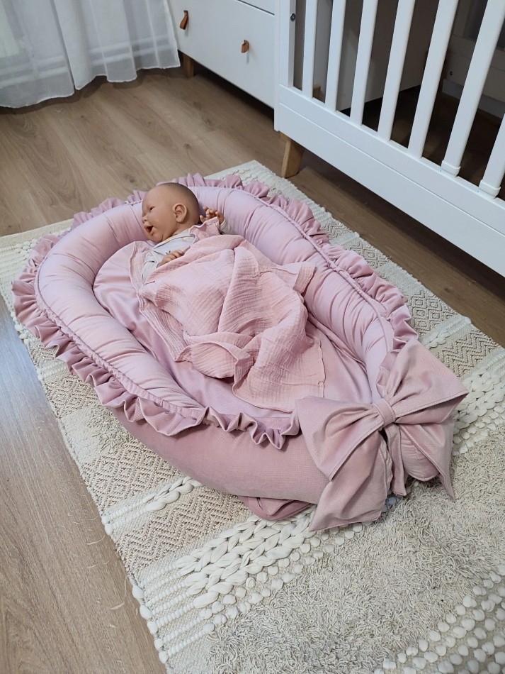 Kokon niemowlęcy z falbanką i dużą kokardą, przeznaczony dla noworodków od pierwszych dni życia aż do nawet 12 miesiąca. Zapewnia poczucie bezpieczeństwa, dając namiastkę tego co dziecko czuło przez 9 miesięcy przed pojawieniem się na świecie. Pomaga ukoić niespokojny sen i nastrój maluszka ponieważ jest niezwykle przyjemny i delikatny w dotyku. Nasze gniazdko niemowlęce to absolutny must have każdej wyprawki! W ofercie posiadamy także inne wzory i kolory kokonów dostępne na naszej stronie tutaj lub w mediach społecznościowych facebook, instagram. Kokon dla noworodka to rozwiązanie bardzo praktyczne, ułatwiające codzienne funkcjonowanie. Znajduje swoje zastosowanie przede wszystkim w łóżeczku, ale i w wielu innych sytuacjach pełniąc rolę przenośnego łóżeczka np. w salonie, kuchni, łazience. Niemowlę śpiąc w kokonie nie odczuwa nagłej zmiany miejsca. Łatwiej jest mu się wyciszyć i zasnąć, ponieważ nawet w obcym miejscu czuje się jak u siebie w domu. Kokon może posłużyć również jako podkładka pod klatkę piersiową dla niemowlaka podczas leżakowania na brzuszku lub w nieco późniejszym okresie życia jako podpórka podczas pierwszych prób siadania. W przypadku starszych dzieci produkt może być rozwiązany w dolnej części, dzięki czemu powstanie strefa nie ograniczająca ruchów nóżek.