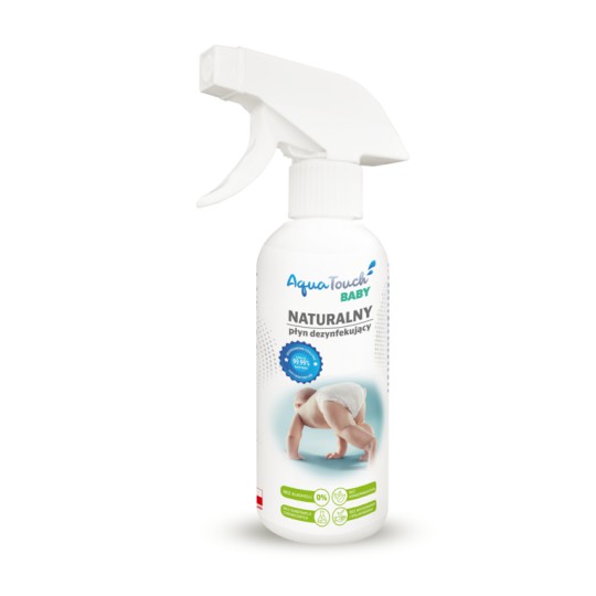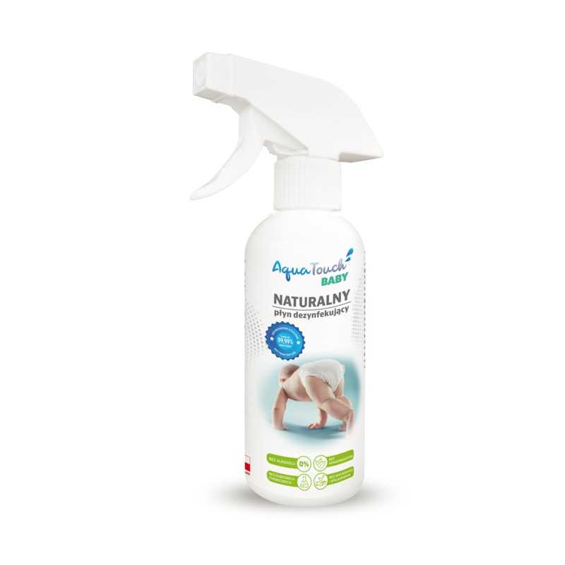 Naturalny płyn dezynfekujący 500 ml AquaTouch Baby to w 100% naturalny produkt, który nie posiada w swoim składzie substancji zapachowych, konserwujących i barwników. Po użyciu pozostaje jedynie czysta woda! Zawiera wytwarzany przez ludzki organizm kwas podchlorawy, który działa na wirusy, grzyby i pleśnie.