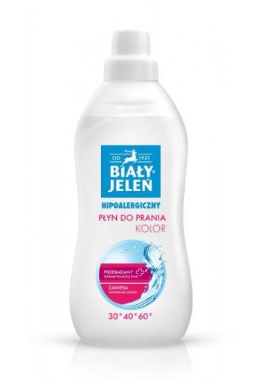 Biały Jeleń Kolor to hipoalergiczny płyn do prania tkanin kolorowych w temperaturach 30°C, 40°C, 60°C w pralkach automatycznych oraz do prania ręcznego. Aktywne składniki płynu oraz system ochrony koloru efektywnie usuwają plamy z tkanin bawełnianych i syntetycznych, nie powodując utraty koloru.