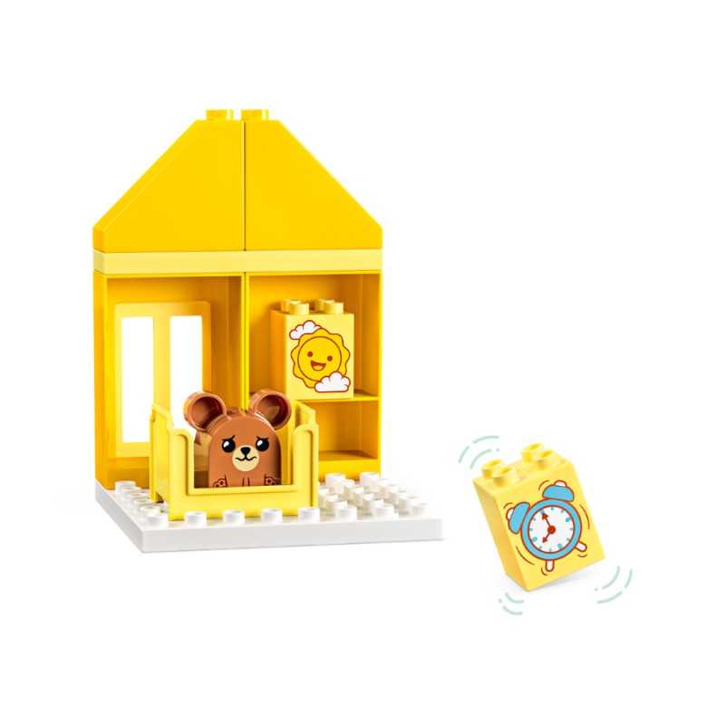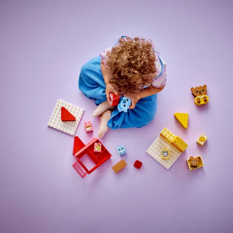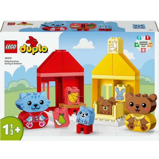 Pomóż dzieciom wyrazić emocje poprzez zestaw LEGO DUPLO Moje pierwsze codzienne czynności - jedzenie i pora snu (10414). Ta ciekawa zabawka dla dzieci w wieku od 18 miesięcy zawiera cztery zwierzątka, z którymi łatwo się zaprzyjaźnić. Takie czynności jak chodzenie spać i jedzenie mogą wzbudzać u maluchów wiele emocji, a dzięki tej zabawce dzieci mogą wyrazić te uczucia. Zestaw zawiera dwie urocze rodziny zwierzątek - z rodzicem i dzieckiem. Figurki kotka i niedźwiadka zawierają klocki z minami - jedna wesoła, druga smutna - dzięki czemu dzieci, które jeszcze nie mówią, mogą pokazać, co czują. Zestawy LEGO DUPLO to świetny sposób na naukę przez zabawę. Podczas interaktywnego odgrywania ról rodzice mogą z pomocą figurek wyjaśnić dzieciom, jak ważne są codzienne czynności. Układając kolorowe klocki w dwa domy, dzieci rozwijają koordynację wzrokowo-ruchową. Każda czynność jest pogrupowana kolorystycznie, więc budowanie pójdzie jak z płatka.