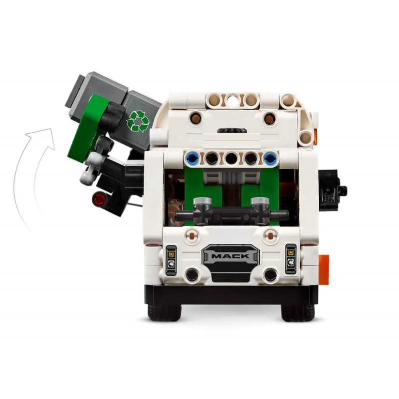 - Realistyczne elementy – Model do składania LEGO Technic Śmieciarka Mack ma boczny załadunek do chwytania, podnoszenia i opróżniania koszy na śmieci