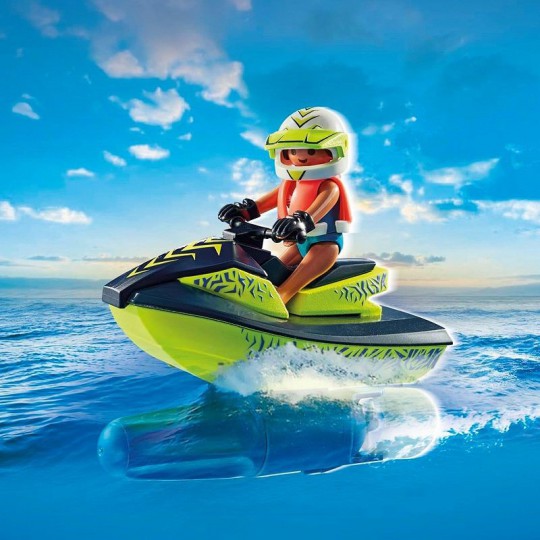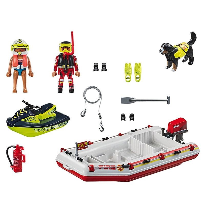 Łódź straży pożarnej ze skuterem wodnym PLAYMOBIL do odważnych misji ratunkowych! Strażak wyposażony w sprzęt do nurkowania ratuje rannego kierowcę skutera wodnego, wspierany przez specjalnie wyszkolonego psa ratownika. Pływająca łódź ma dwa siedzenia z zaciskami na stopy figurki, wiosła i obrotowy silnik zaburtowy. Figurka może zostać umieszczona na skuterze wodnym, unoszącym się na wodzie. Zarówno głową, jak i ogonem psa można poruszać, wyposażony w odpinaną uprząż kamizelki ratunkowej, której figurka może się trzymać. Idealny zestaw do wielogodzinnego odgrywania ról i bohaterskich akcji ratunkowych w wodzie w pokoju dziecięcym. Idealny prezent lub upominek dla małych bohaterów w wieku od 4 lat!