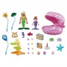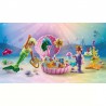 Przyjęcie urodzinowe syrenek jest 43-elementowym zestawem z linii Playmobil Princess Magic. Stań się częścią magicznego świata i weź udział w imprezie urodzinowej syrenek!Wszystkiego najlepszego, syrenko! Umieść baloniki i prezenty w dużej różowej muszli, a tort urodzinowy i pyszne muffinki rozłóż na stoliczku. To będą cudowne urodziny! Zobacz, muszelki z przyssawkami utrzymują się magicznie na gładkich powierzchniach!Zestaw upominkowy Playmobil w estetycznym, ozdobnym opakowaniu jest idealny na prezent. Na nadrukowanym bileciku wpisz imię dziecka i gotowe!