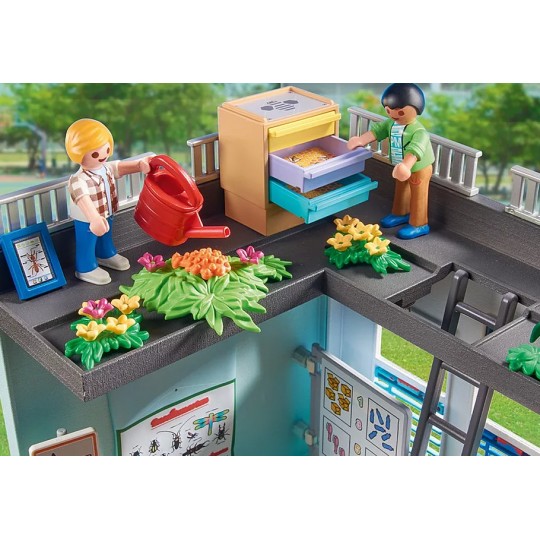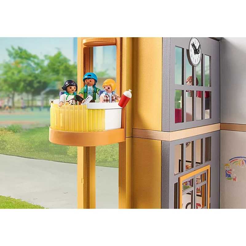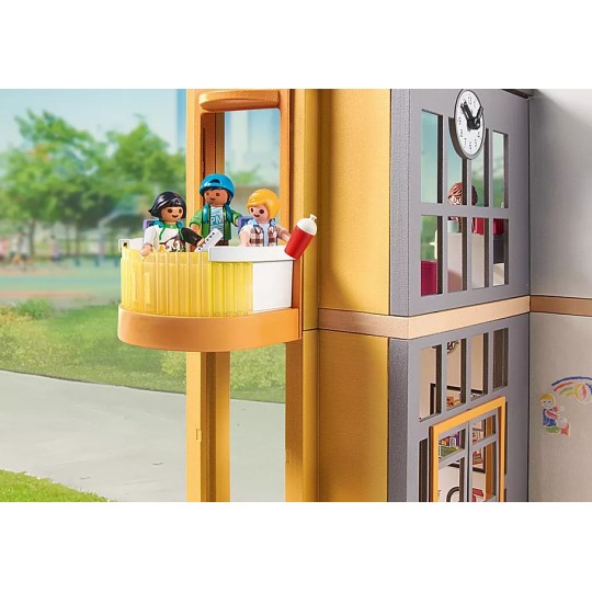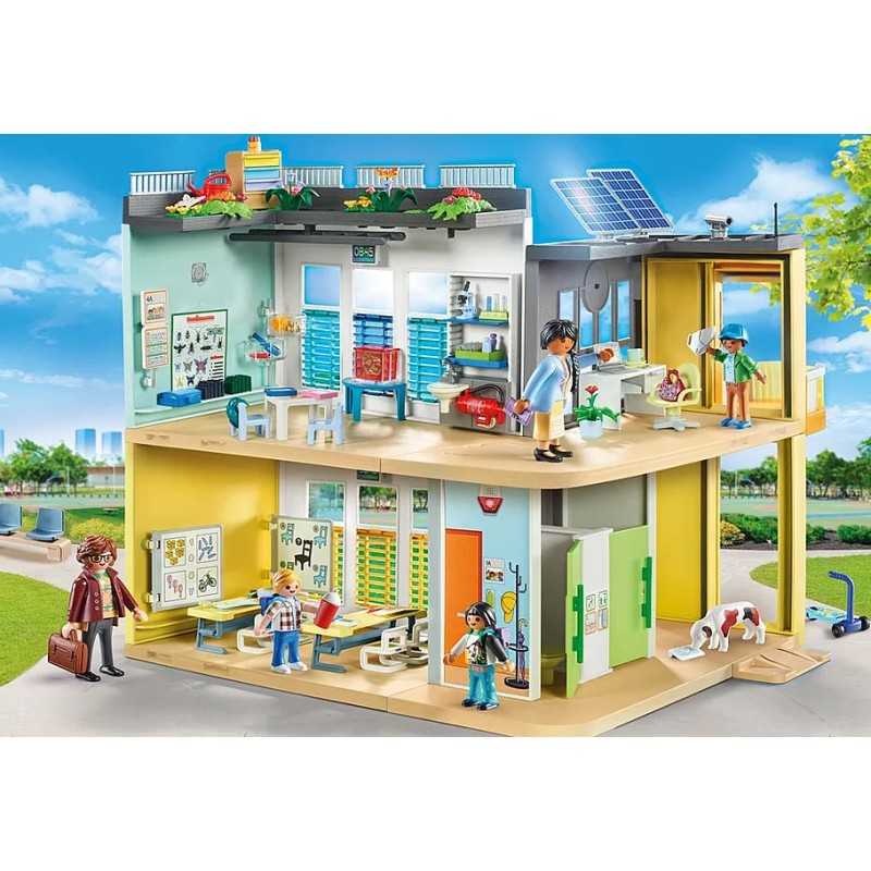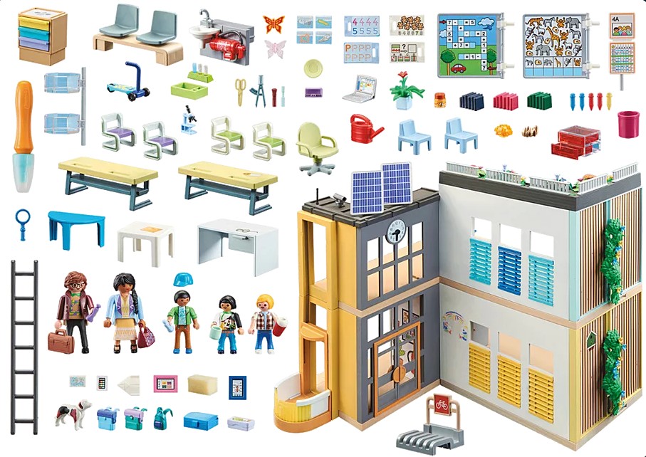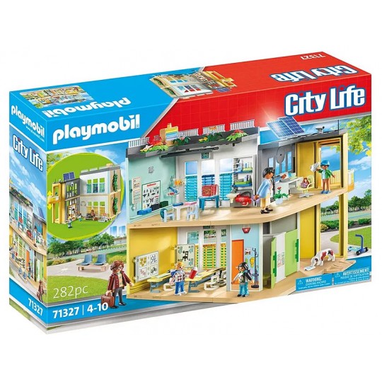 Duża szkoła z serii City Life od Playmobil jest 282-elementowym zestawem. Duży szkolny budynek z windą, meblami i wyposażeniem jest idealny do pomysłowej zabawy w odgrywanie ról.W szkole uczniowie korzystają z różnych sal lekcyjnych, a dzięki ruchomej, interaktywnej tablicy i arkuszom do malowania nauka jest ciekawsza. Szkoła wyposażona jest w toaletę przystosowaną do wózków inwalidzkich oraz windę z rampą na parterze. Na zielonym tarasie na dachu można obserwować owady i pszczoły.Nowoczesna szkoła Playmobil to zestaw, który pozwoli dzieciom o dociekliwych umysłach odkryć nowe pasje i zamiłowanie do nauki. Świetny prezent na rozpoczęcie roku szkolnego lub urodziny dla dzieci w wieku od czterech lat.