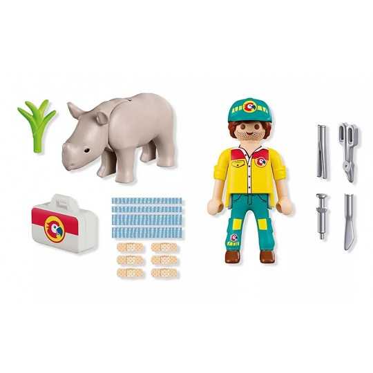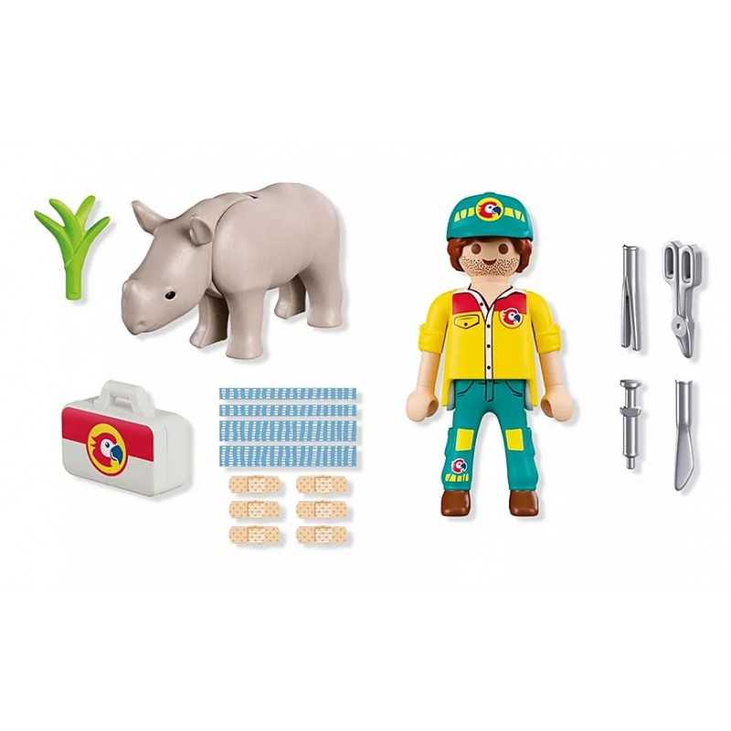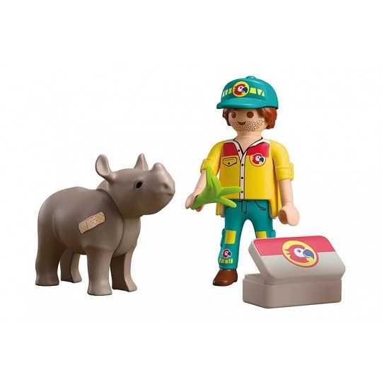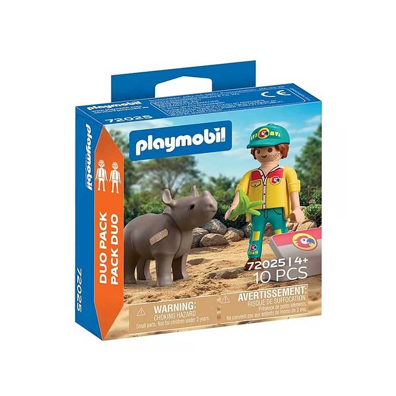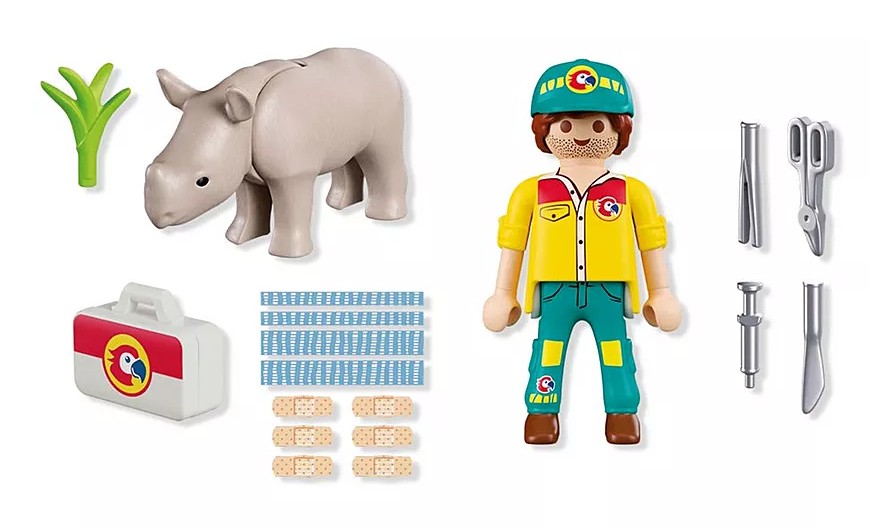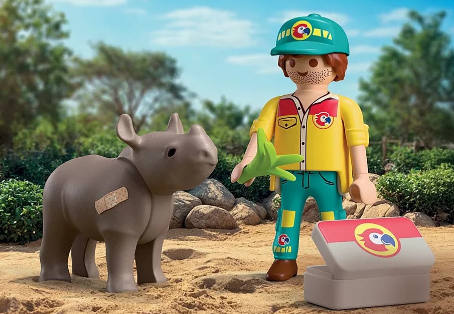 DuoPack STRAŻNIK LEŚNY Z NOSOROŻCEM to poruszający zestaw dla dzieci, który wprowadza w świat troski o dzikie zwierzęta i odpowiedzialnej opieki. Scenka z młodym nosorożcem wymagającym pomocy pozwala dziecku wcielić się w rolę opiekuna, który dba o zdrowie i bezpieczeństwo swojego podopiecznego. To idealna propozycja dla małych miłośników przyrody i zwierząt. Zabawa koncentruje się na empatii i uważności. Strażnik leśny korzysta z walizki lekarskiej i narzędzi medycznych, by pomóc rannemu zwierzątku wrócić do formy. Ruchoma głowa nosorożca oraz możliwość użycia plastrów sprawiają, że scenka nabiera realizmu i zachęca do odgrywania opiekuńczych sytuacji. Dziecko uczy się, że pomoc i cierpliwość mają znaczenie, a każda czynność wpływa na samopoczucie zwierzęcia. Prezentowany zestaw Playmobil wspiera rozwój emocjonalny dziecka, pobudza wyobraźnię i buduje pozytywne postawy związane z opieką nad zwierzętami.