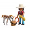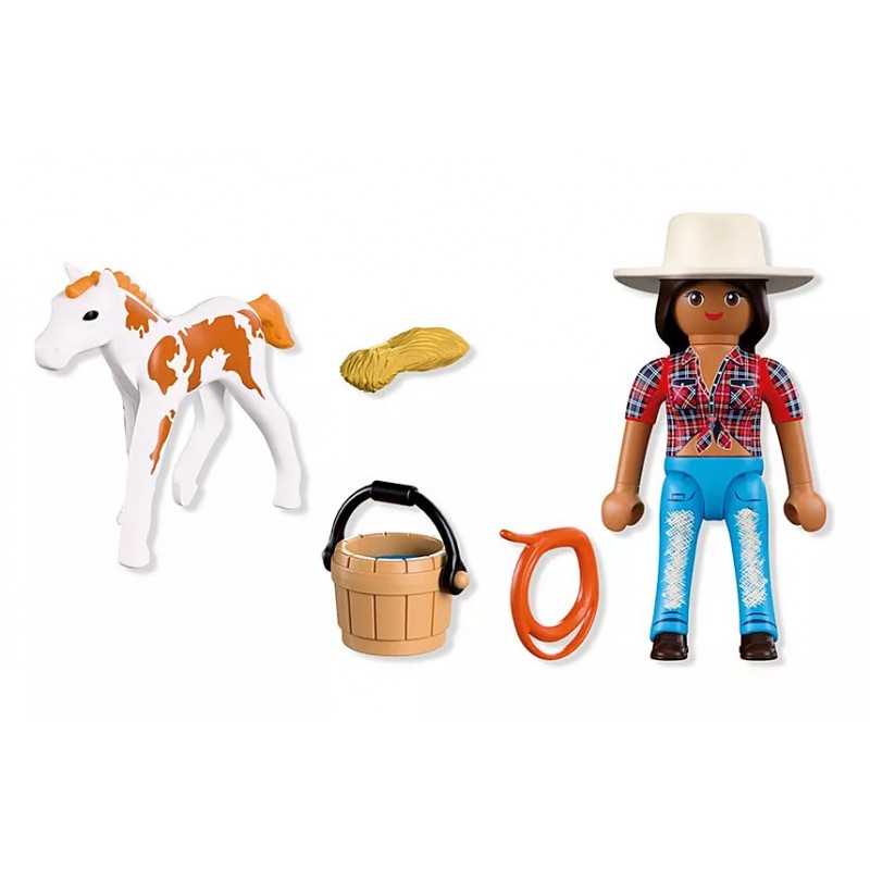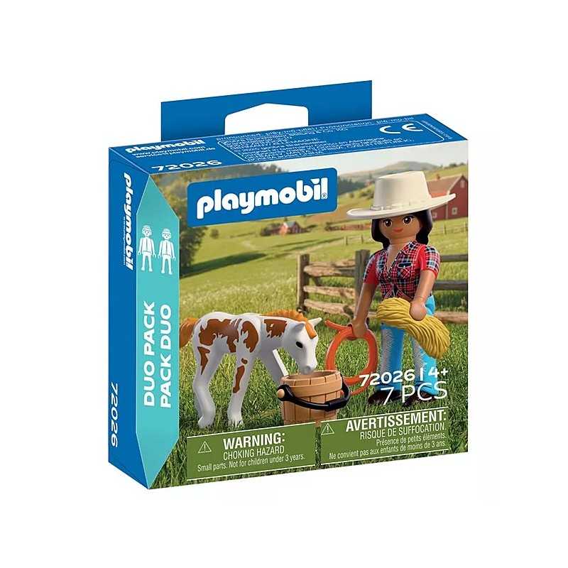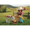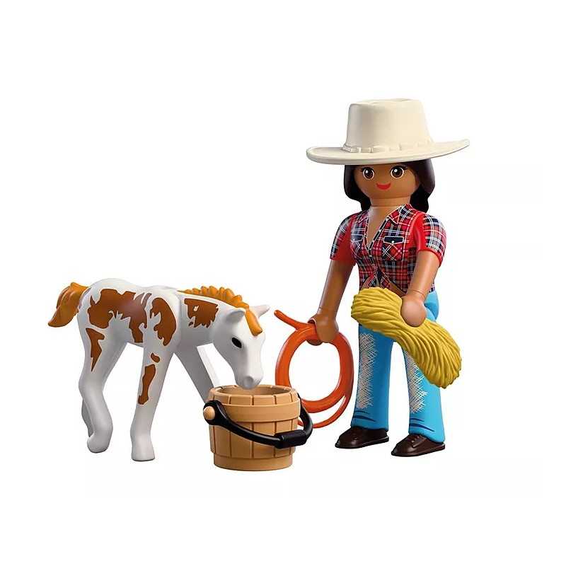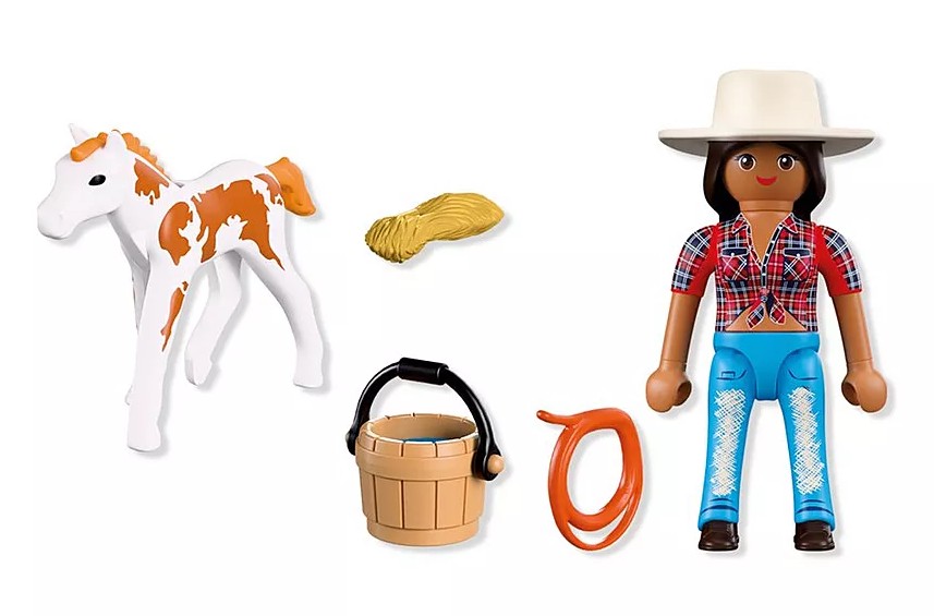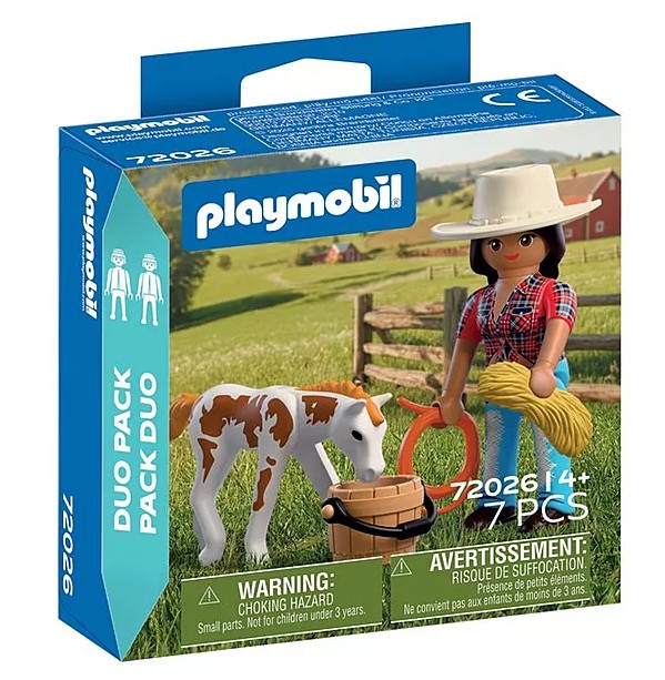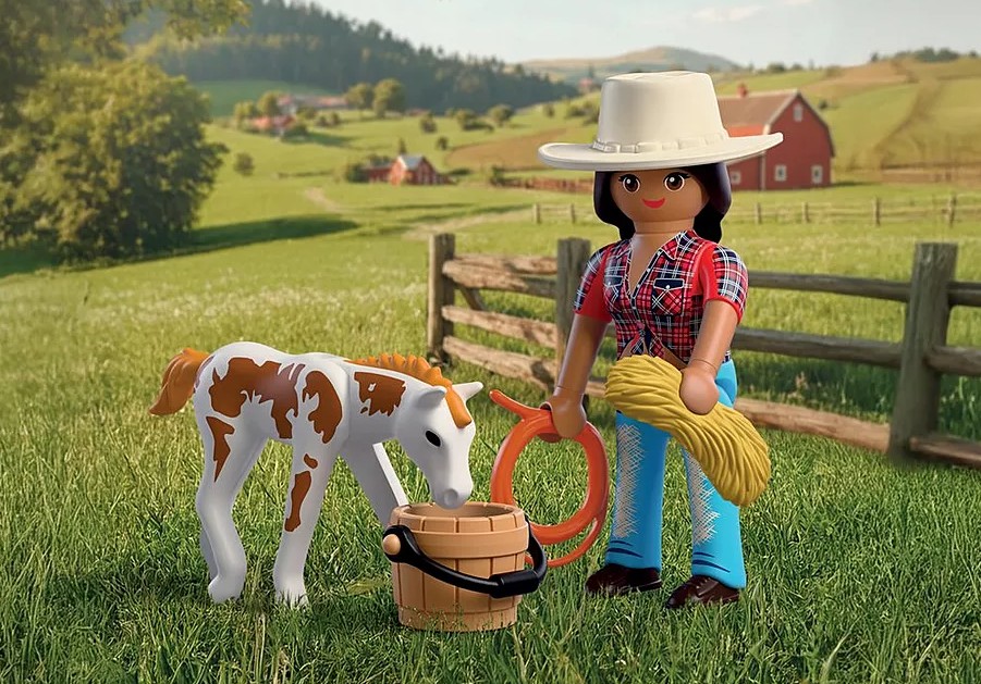DuoPack KOWBOJKA ZE ŹREBAKIEM to pełen ciepła zestaw, który zaprasza dzieci do świata opieki nad zwierzętami i życia na ranczu. Historia młodej kowbojki i jej źrebaka Appaloosa skupia się na trosce, odpowiedzialności i budowaniu więzi z małym koniem. To idealna propozycja dla dzieci, które lubią spokojną, narracyjną zabawę i tworzenie własnych opowieści. Ruchoma głowa źrebaka sprawia, że opieka nad nim staje się jeszcze bardziej realistyczna. Dziecko może podawać wodę, przygotowywać siano i tworzyć niewielkie pastwisko z dostępnych akcesoriów. Proste czynności, takie jak karmienie czy dbanie o komfort zwierzęcia, rozwijają empatię oraz uczą delikatności i uważności podczas zabawy. DuoPack doskonale uzupełnia świat Playmobil z końmi i ranczem (zestawy sprzedawane osobno). Ten niewielki, ale bardzo klimatyczny, zestaw Playmobil wspiera rozwój dziecięcej wyobraźni i buduje pozytywne skojarzenia związane ze zwierzętami.