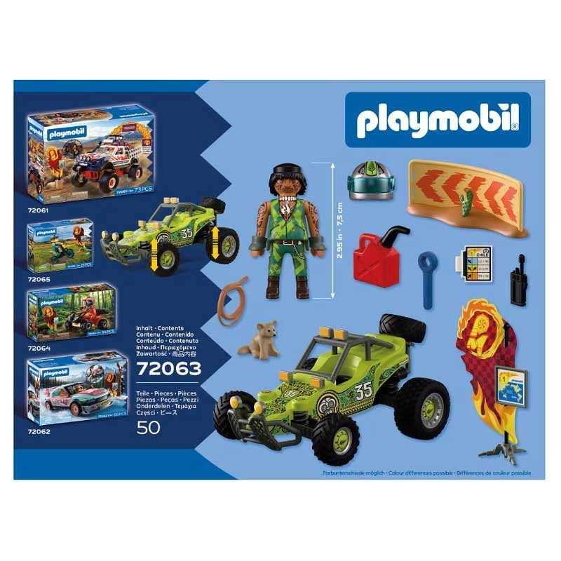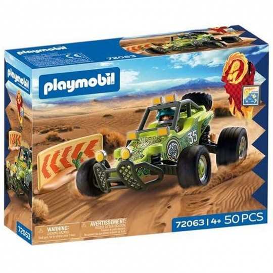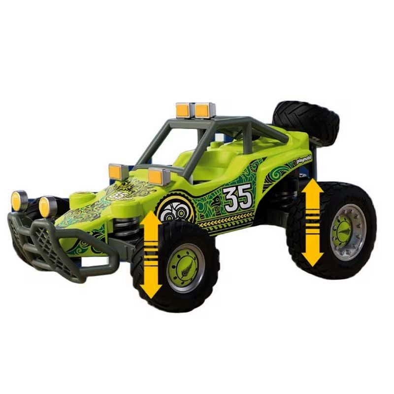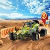 Playmobil 72063 Offroad Buggy „Desert Race Chile" Ekstremalny etap „Ring of Fire" Pełna prędkość przez pustynię! Wirujący piasek, palące słońce i niekończące się wydmy – nowozelandzki kierowca rajdowy podejmuje wyzwanie jednego z najbardziej wymagających etapów wyścigu Ring of Fire w chilijskiej pustyni. Jego zaawansowana terenowa buggy została zaprojektowana z myślą o jeździe w ekstremalnych warunkach. Amortyzowane tylne zawieszenie zapewnia stabilność i komfort jazdy nawet na bardzo nierównym terenie. Na tylnej części pojazdu znajduje się uchwyt z zapasowym kołem, które można łatwo zdjąć i wykorzystać do wymiany przednich opon podczas rajdu. Buggy wyposażona jest w niezbędny sprzęt rajdowy: narzędzia, kanister z paliwem, linę oraz walizkę z mapą i krótkofalówką, dzięki czemu kierowca jest przygotowany na każdą sytuację w trakcie wyścigu. Z przodu pojazdu znajduje się solidny pałąk ochronny z mocowaniem na dodatkowe reflektory, które świetnie sprawdzają się podczas nocnej jazdy po pustynnym szlaku. Scenerię wyścigu uzupełniają elementy toru – barierka, kaktus oraz ciekawscy „widzowie”, czyli młode lisy pustynne, które obserwują zmagania kierowcy z bezpiecznej odległości. To idealny zestaw dla małych fanów wyścigów, pojazdów terenowych i przygód w ekstremalnych warunkach.