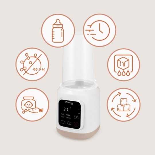Urządzenie delikatnie podgrzewa mleko, wodę i obiadek, utrzymując stałą temperaturę nawet przez 24 godziny. Masz też do dyspozycji funkcje rozmrażania, szybkiego podgrzewania oraz sterylizacji, która usuwa do 99,9% bakterii. Tryb sterylizacji butelek i akcesoriów