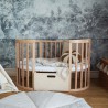 Bawełniane prześcieradło, skrojone na wymiar dużego materaca do owalnego łóżeczka 7w1. Prześcieradło wykonane jest z grubego, bawełnianego jersey'u, zakończone gumką elastyczną.