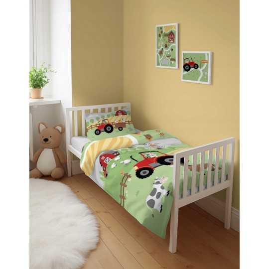 Pościel bawełniana dziecięca 100x135 cm farma czerwony traktor to idealny wybór dla małych miłośników zwierząt i wiejskich przygód. Barwna grafika przedstawiająca traktor i malowniczą farmę przenosi dziecko w radosny świat zabawy i odkrywania natury. Pościel wprowadza do pokoju dziecięcego bajkowy klimat, który rozwija wyobraźnię i daje poczucie bezpieczeństwa. Komplet posiada dwustronny wzór – z jednej strony duża ilustracja farmy z traktorem i zwierzątkami, z drugiej drobny, powtarzalny motyw w jasnej tonacji, który świetnie urozmaica aranżację. Dzięki temu zestaw jest praktyczny i dekoracyjny zarazem. Wykonany ze 100% naturalnej bawełny, zapewnia komfort, przewiewność i miękkość, a bezpieczne suwaki ułatwiają codzienne użytkowanie.