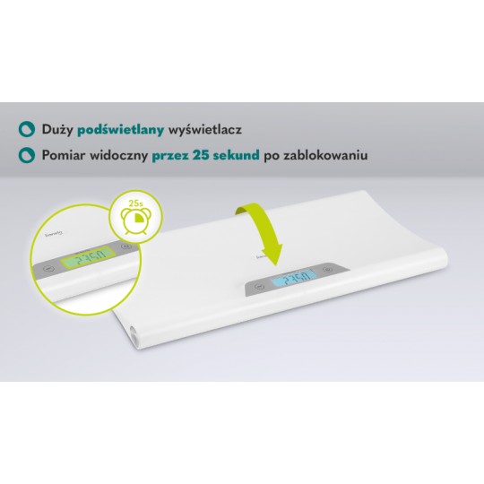 Aby ułatwić odczyt, wynik wyświetlany jest przez 25 sekund po zablokowaniu – również po podniesieniu dziecka – a ostatni pomiar zostaje zapisany w pamięci wagi i można go odczytać zaraz po włączeniu.