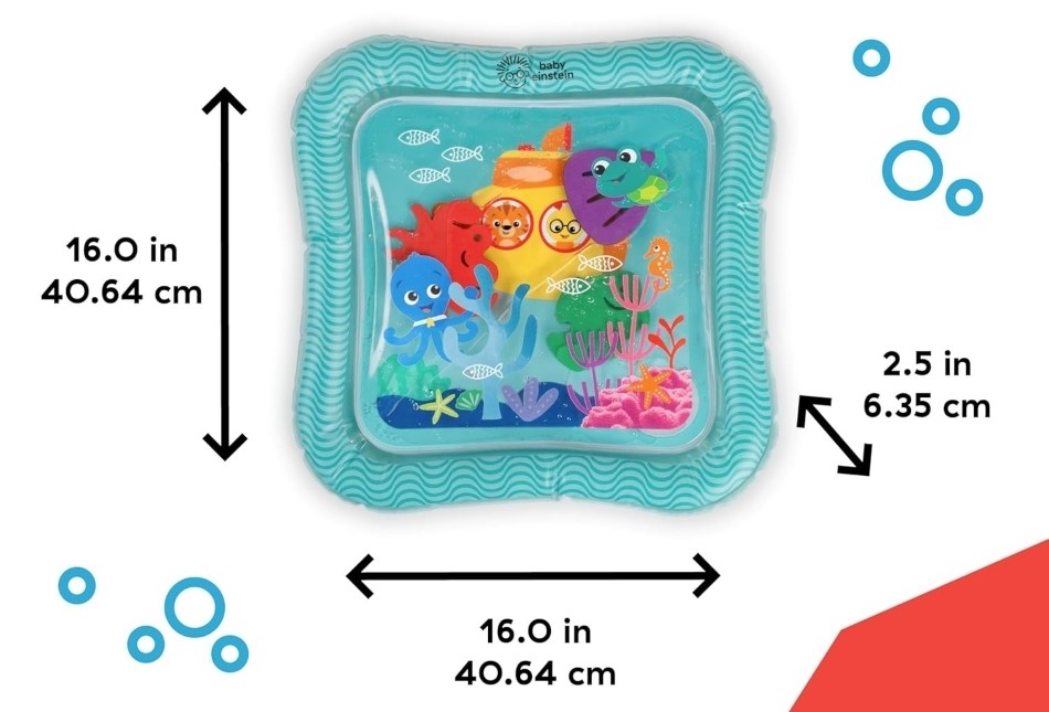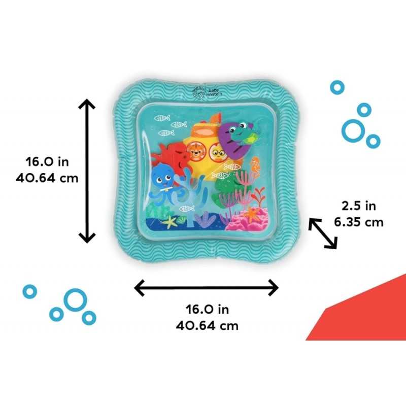 Mata wodna Baby Einstein Ocean Explorers Sensory Splash to uzupełniana mata wodna, która jest idealna do odkrywania w pozycji na brzuszku. Ta miękka mata z 3 pływającymi morskimi stworzeniami zachęca dziecko do odkrywania w pozycji na brzuszku. Dziecko z przyjemnością będzie poruszać poszczególnymi stworzeniami morskimi w wodzie, szturchając je lub popychając. Zachęca to do odkrywania sensorycznego, uczenia się przyczyny i skutku oraz umiejętności motorycznych. Można prać. Wymiary: 40,64 x 40,64 x 6,35 cm.