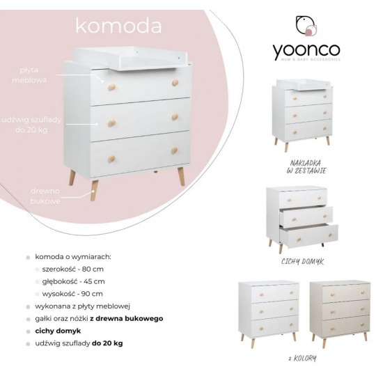 Komoda yoonco z przewijakiem to mebel, który spełni potrzeby zarówno rodziców, jak i dzieci. Dzięki połączeniu minimalistycznego designu, wysokiej jakości wykonania i funkcjonalności, idealnie sprawdzi się jako komoda do pokoju dziecka, oferując wygodne miejsce do przechowywania ubranek, kosmetyków i akcesoriów pielęgnacyjnych.