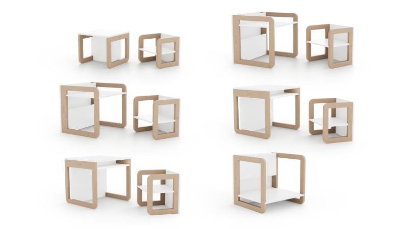 wielofunkcyjny zestaw meblowy – może posłużyć jako taboret, krzesło, stół, biurko oraz kanapa z regałem,