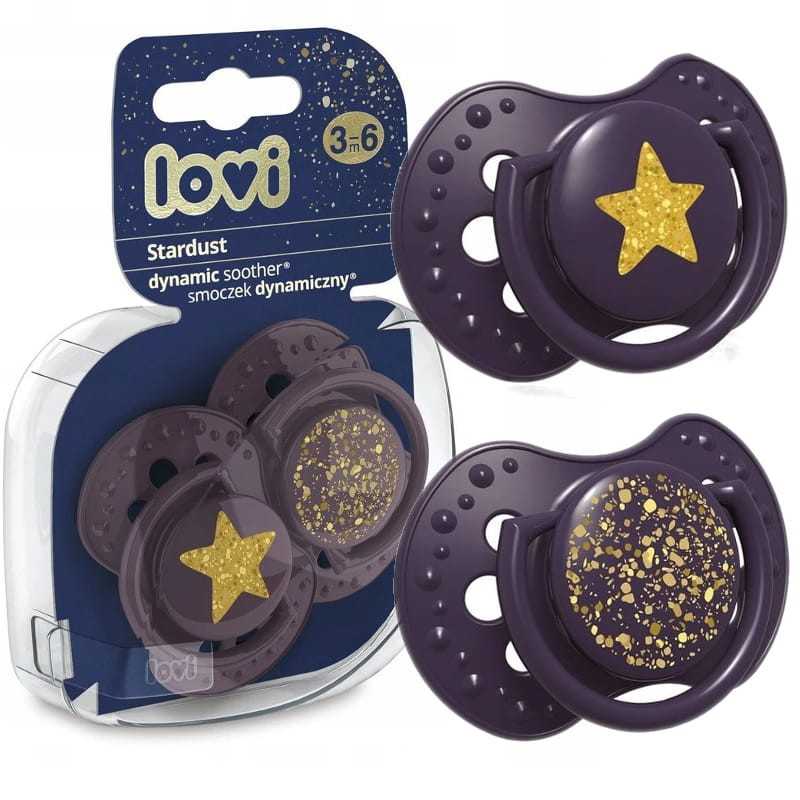 Dynamiczny smoczek uspokajający LOVI został stworzony we współpracy z neurologopedami. Ma unikalną budowę z niejednorodnego silikonu i symetryczny kształt inspirowany brodawką sutkową. Nie zaburza odruchu ssania i naturalnego rozwoju mowy i zgryzu*. Wyjątkowy design i  kolorystyka smoczka podkreśla unikalność kolekcji Stardust.
