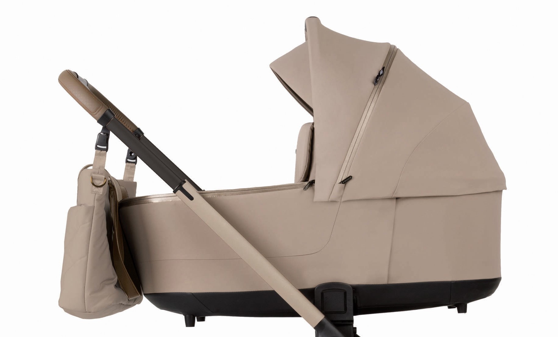 Rączka wózka jest regulowana, dzięki czemu można ją dopasować do wzrostu osoby prowadzącej. Wykończenie z eko-skóry nie tylko wygląda elegancko, ale również zapewnia pewny chwyt i wygodę użytkowania.