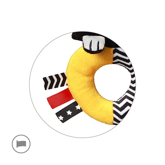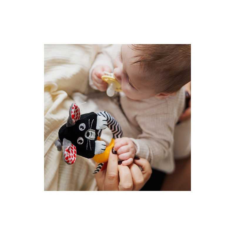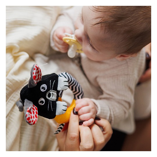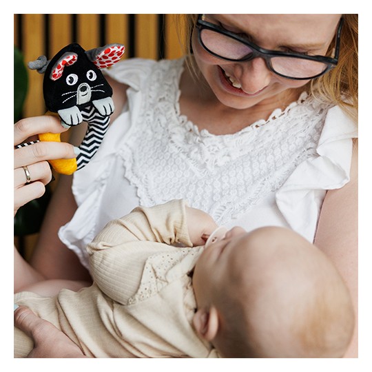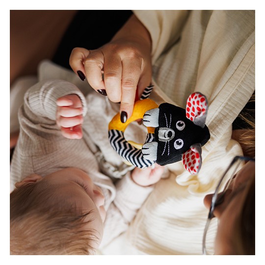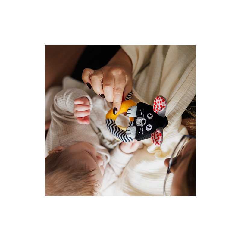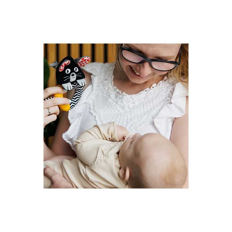 • KONTRASTOWE KOLORY- Zaprojektowaliśmy ją z myślą o najmłodszych. Czarno-białe kontrasty oraz czerwone i żółte akcenty to pierwsze kolory, które dostrzega niemowlę. Kontrastowa grzechotka stymuluje wzrok już od wczesnych miesięcy życia.
