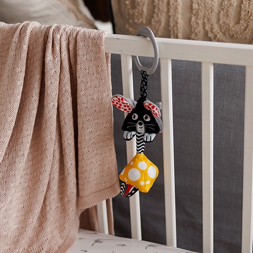 Miękka, kontrastowa grzechotka z sympatyczną myszką umili czas Twojego maluszka w domu i na spacerach. Po potrząśnięciu zabawka wydaje dźwięki, które przykuwają uwagę i stymulują słuch. Szeleszczące uszy zachęcają do dotyku, a zwijany ogonek i barwne metki do chwytania. Wykonaliśmy ją w kontrastowych kolorach i ozdobiliśmy geometrycznymi wzorami, by wspierała rozwój wzroku Twojej pociechy już od pierwszych miesięcy życia. Pluszowa grzechotka dla niemowląt została wykonana z bezpiecznych, miękkich materiałów. Jest lekka, poręczna i łatwa do chwycenia. Wspiera rozwój motoryki małej, stymuluje zmysły i pobudza wyobraźnię.